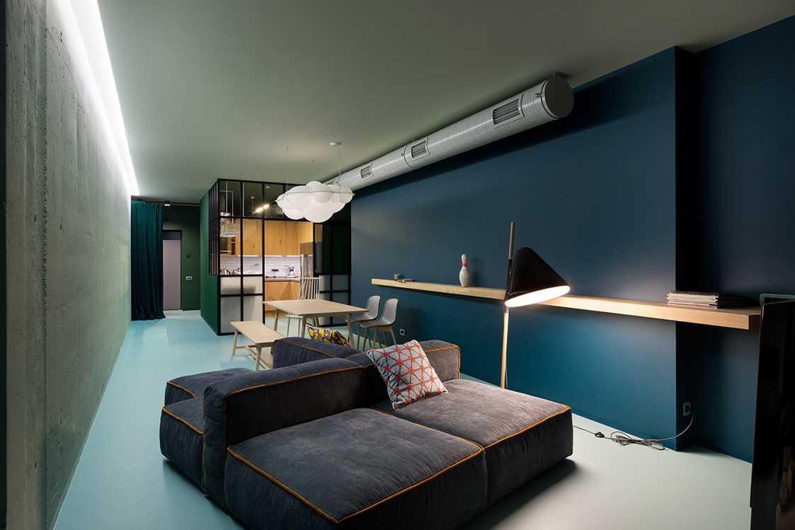 Гостиная объединена с кухней и столовой, а спальное место отделяется перегородкой, выполненной из металла и стекла. Днем ее можно сложить и прислонить к стене, так она не займет много места. Входная зона и санузел изолированы от основного объема квартиры. Кроме того, имеется постирочная.