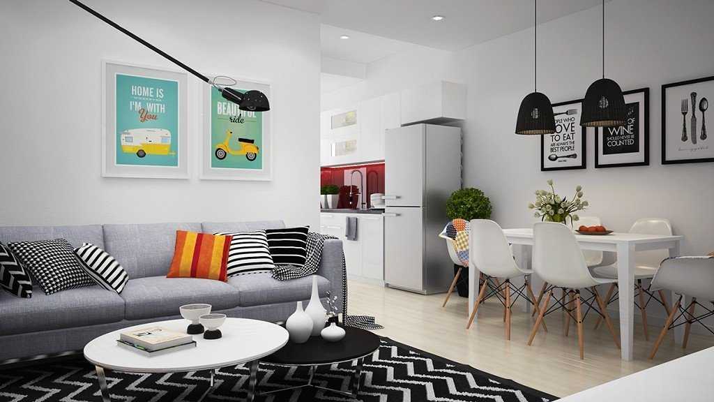 - это универсальный стиль, который подойдет для пространства любого типа и размера. Допускается демонтаж перегородок и совмещение кухни и гостиной. Приветствуется строгая геометричность в планировке;