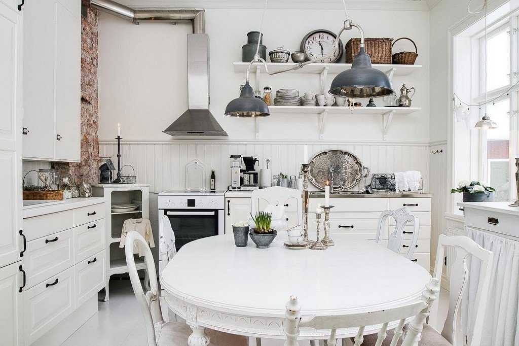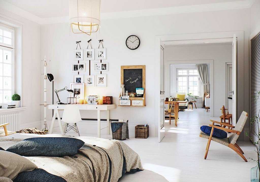 - доминирующий цвет стиля – белый, но сегодня также часто используются пастельные и серые оттенки. Одна из стен может быть окрашена в густой цвет теплой палитры. В помещении должно использоваться не более пяти цветов, аксессуары и текстиль могут быть яркими;