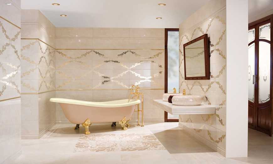 Классические интерьеры декорируются белыми и молочного оттенка плитами с включением насыщенных бордовых тонов. Допускается монтаж золотистого изящного орнамента в отделке пола либо стен.