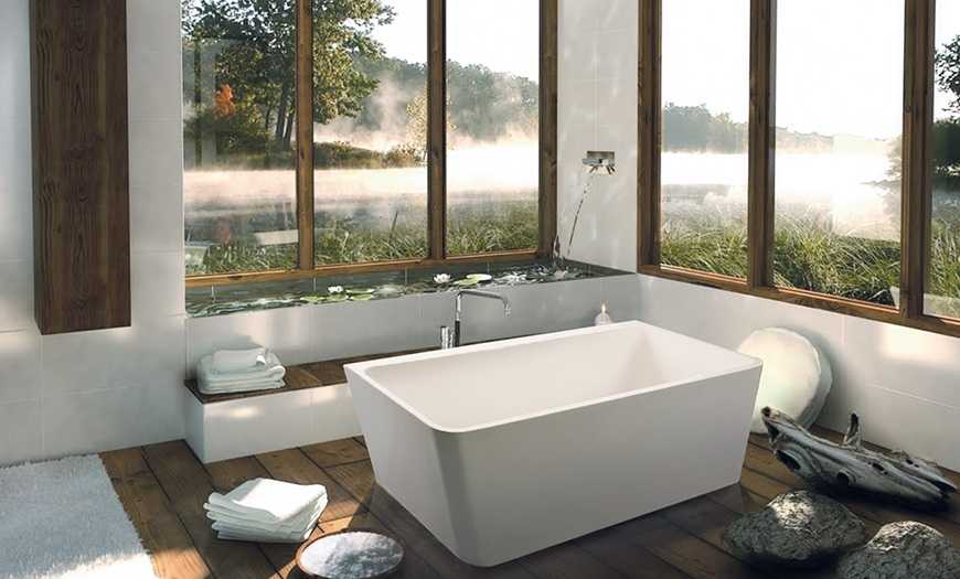 - Ванна напротив окна. Возможны 2 варианта: фрамуга над самой чашей (так было в хрущевках) или отдельностоящая ванна в непосредственной близи от проема. Второй способ рекомендуется при наличии красивого вида — тогда вы сможете организовать домашнее SPA и наслаждаться водными процедурами по вечерам.
