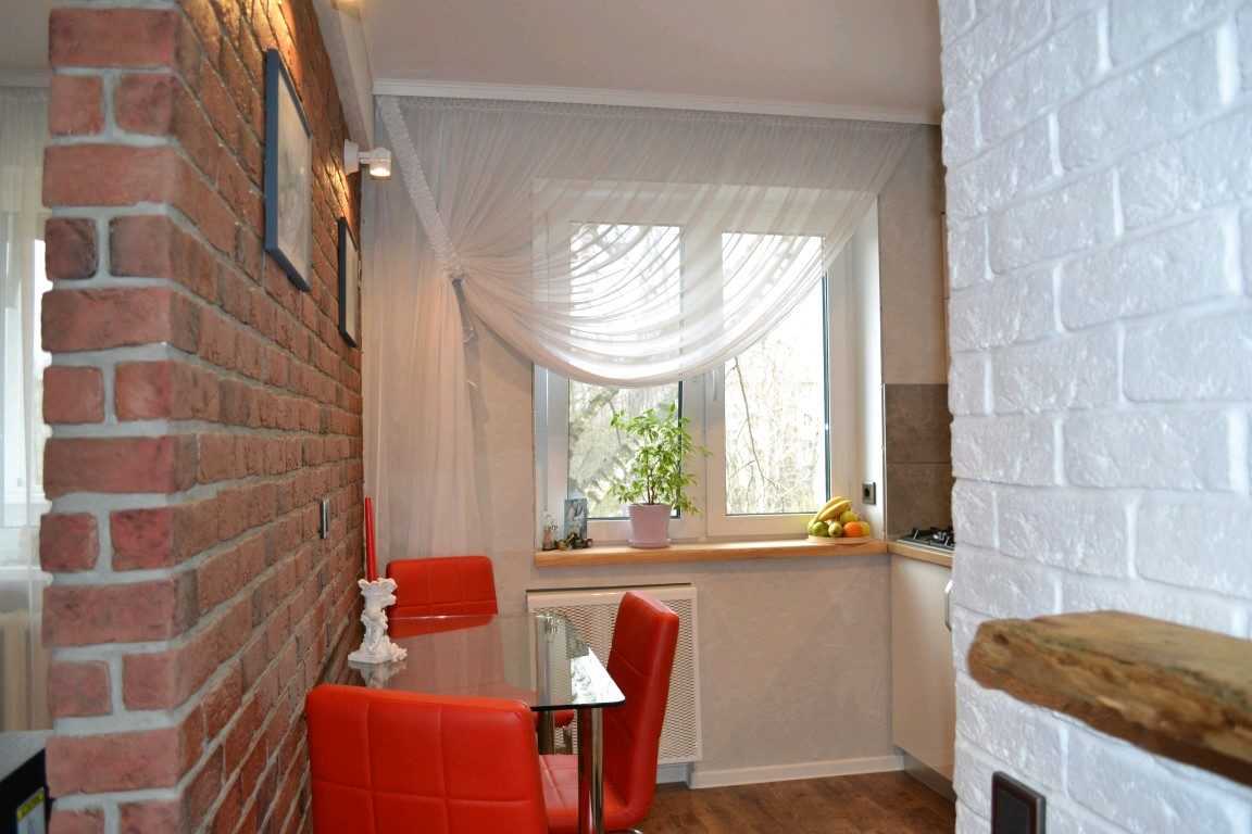 Позволит визуально расширить пространство, добавив ему объема. Подоконник с окном нужно использовать как элемент зонирования. Хорошо впишется сюда мини барная стойка, на которой можно готовить, обедать, сидеть с друзьями. Шторы в стиле кафе станут отличным решением в этой планировке.