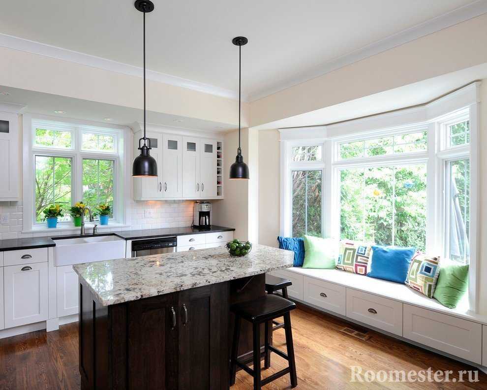 Пространство возле широких окон, наполняющих комнату светом, можно использовать для организации мест отдыха, например, комфортабельных лежанок. Можно подобрать мягкий уголок, сочетающийся по форме изгибов. Рядом поставить удобный стол, получив в итоге полноценную обеденную зону. Отлично смотрятся в месте рядом с эркером, организация рабочей зоны, позволяя хозяйке наслаждаться пейзажами во время готовки.