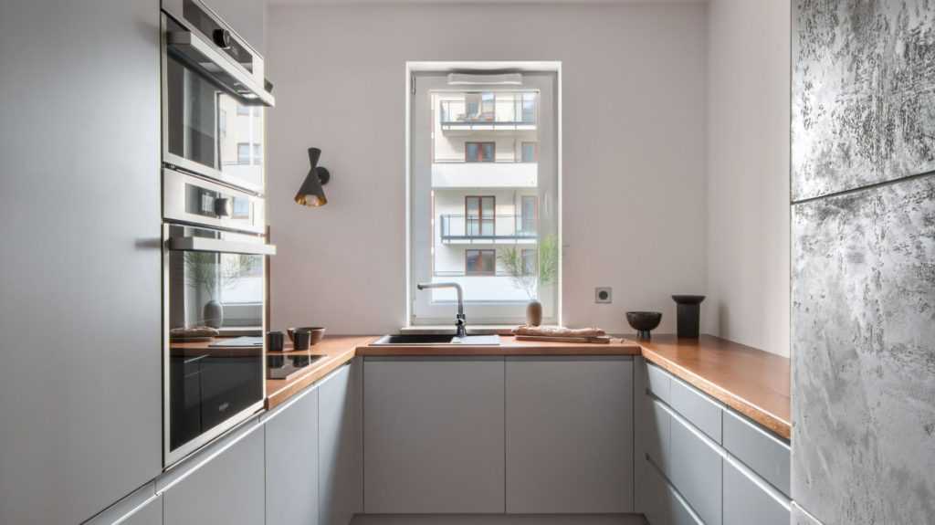 Замаскировать трубы коммуникаций и вытяжку можно с помощью фасадов, тогда кухня будет выглядеть гармонично и привлекательно. Бытовую технику также следует выбирать узкую, ведь каждый сантиметр на маленькой кухне — на вес золота. Ширина посудомоечной машины не должна превышать 45 см, тогда найдется место для мойки сразу с двумя чашами.
