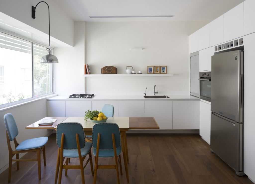 Однако следует помнить, что расстояние между стеной напротив и гарнитуром должно составлять не менее одного метра, в противном случае помещение будет очень тесным и неудобным. Напротив гарнитура можно расположить вмонтированный в стену откидной стол.