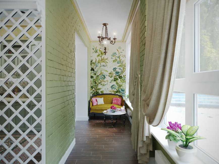 Длинная лоджия в стиле прованса с плотными шторами из натуральной ткани