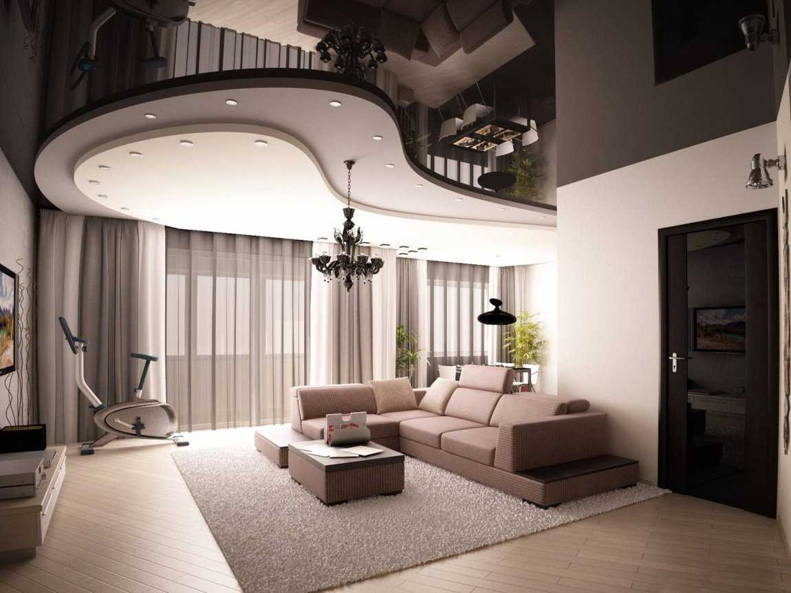 В таких комнатах создаётся впечатление простора. Даже если метраж невелик, помещение не кажется тесным. Появляется свобода в дизайне: не нужно следить, чтобы потолок не давил на голову. Он сможет стать акцентом: ярким, тёмным, с необычной отделкой. Если это вписывается в стиль, используют лепнину. Также создают многоуровневые конструкции, которые скрывают коммуникации.