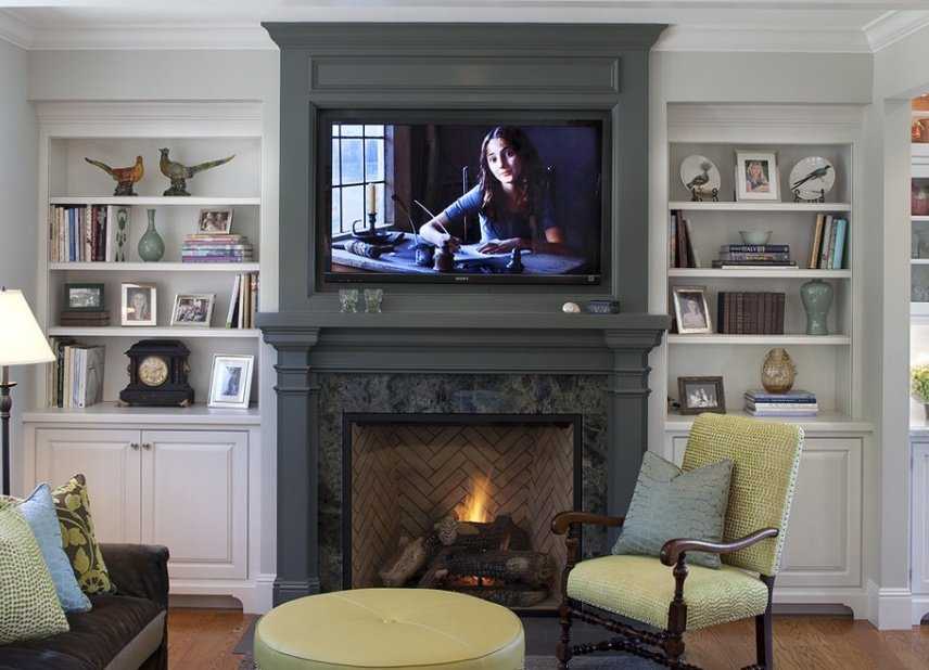 Поскольку камин является основным акцентом комнаты, то не следует отвлекать от него внимание, размещая много предметов. Поэтому лучший вариант — расположение стеллажей по обе стороны от него