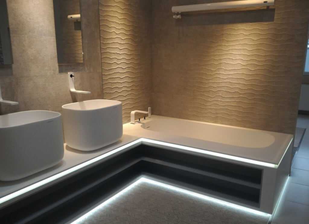 Светодиодная лента благодаря своей гибкости позволяет оформлять выемки, ниши под ванную. Или можно непосредственно освещать зону ванны/душевой.
