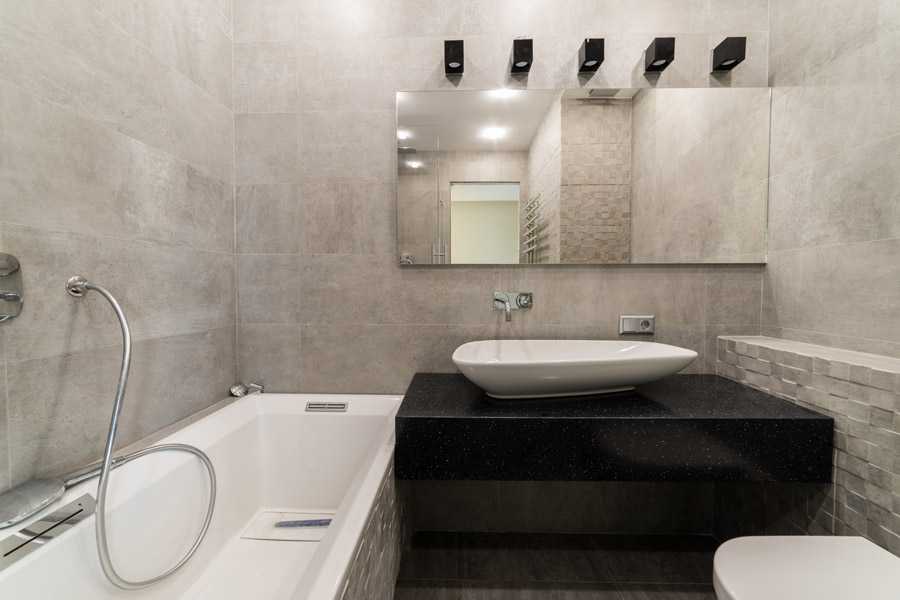 При определении количества и мощности светильников также следует пользоваться маленькой поправкой на цвет стен помещения. Светлые стены лучше рассеивают свет, а значит можно ставить лампы меньшей мощности (умножаем результат на 0,8). Если же дизайн ванной предполагает тёмные цвета, расчётное число светильников нужно умножить на 1,5. На столько же увеличивается результат, если потолки выше 3 м. Также потолочное покрытие накладывает определённые ограничения на использование ламп. Наиболее чувствительны к нагреву пластиковые панели и плёночные полотна из ПВХ, менее восприимчивы — реечные и тканевые покрытия, далее идут гипсокартонные конструкции и сами бетонные потолки. Для первых двух покрытий допускаются светодиодные, люминесцентные и маломощные галогенные лампочки. Для последних — можно использовать любые лампочки, но разумеется, не располагая их ближе, чем на 10 см к поверхности.