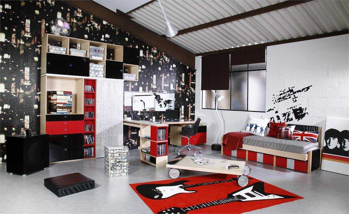 Роковый стиль обязывает к преобладанию в интерьере серого или бежевого цветов, обилию фотографий кумиров, наличию музыкальных инструментов, жалюзи на окнах. Мебель при этом должна иметь строгие очертания, без «наворотов». Если в доме проживает меломан, предпочитающий громкую музыку, или талантливый музыкант, взрослым стоит позаботиться о звукоизоляции. Это позволит юному обитателю квартиры свободно наслаждаться любимыми мелодиями, а его родителям спокойно отдыхать после рабочего дня.