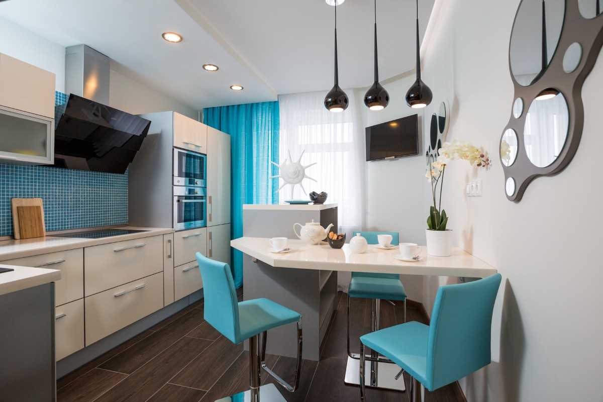 Яркий цвет морских волн, сочетающий в себе природную силу зеленого и спокойствие синего — отличный выбор для расстановки акцентов на белой кухне. Бирюзовый нравится творческим людям, которые полны идей. Вот взгляните на примеры. Цвет морской волны помогает сделать стерильный интерьер светлой кухни теплым и домашним.