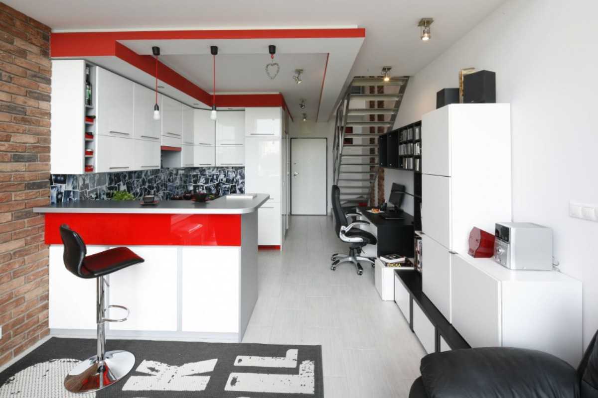 - дизайн прямоугольной квартиры-студии 30 кв. м предполагает подбор многофункциональной мебели, которая заменить несколько предметов интерьера одновременно. Например, поставить барную стойку. Она узкая, небольшая, сможет заменить и обеденный стол, и письменный;