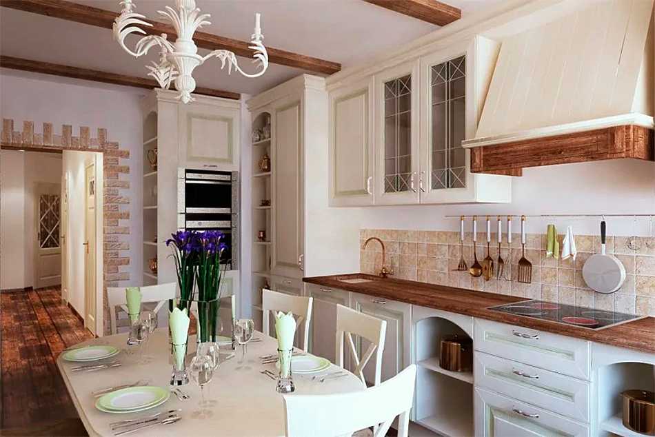 - Все детали и элементы должны идеально сочетаться дру с другом, чтобы не «выпадать» из идеии композиции. Большая часть кухонь отделывается в классическом направлении – мебель с деревянными или ДСП-фасадами, неброская пастельная цветовая гамма, приятный текстиль и декоративная керамика.
