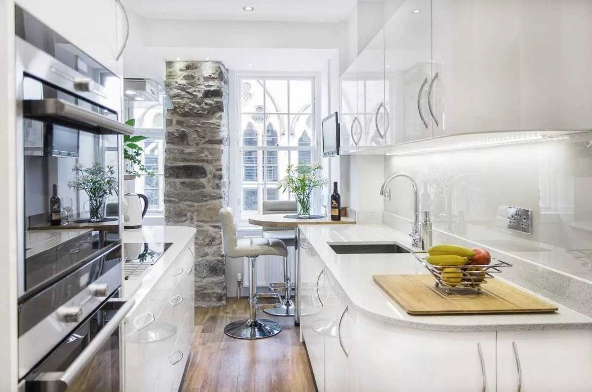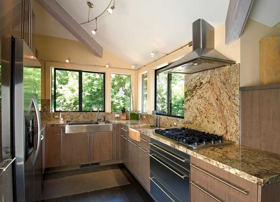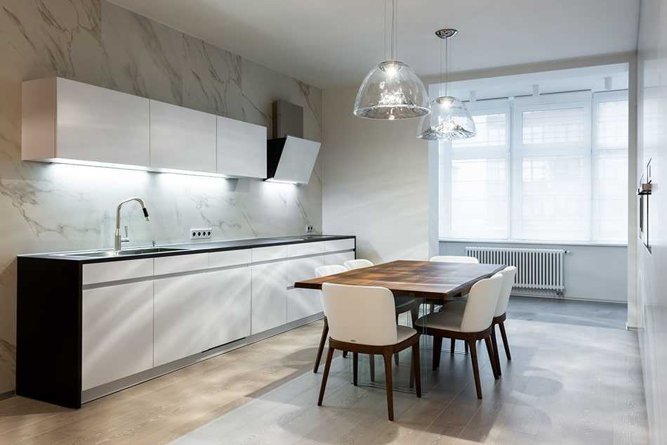 Любителям современных решений специалисты дизайна советуют присмотреться к стилю модерн. По причине отсутствия броской роскоши, добиться уюта и комфортной обстановки можно благодаря однотонным каменным столешницам и аналогичной вставке на стене в обеденной зоне.