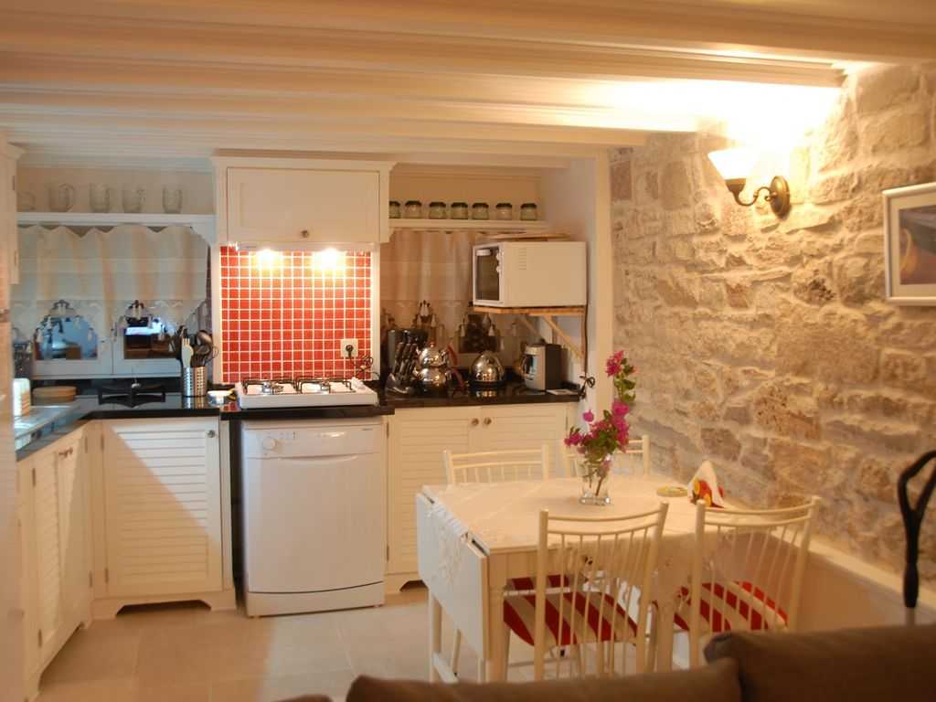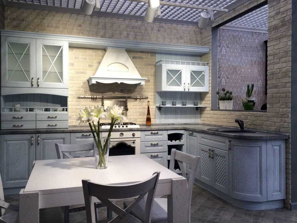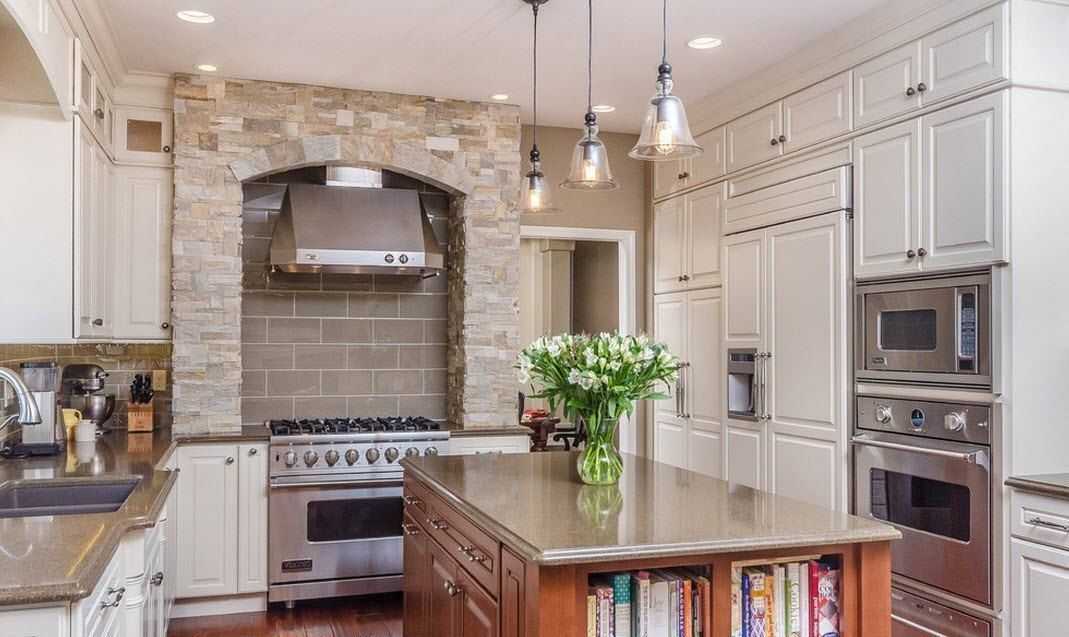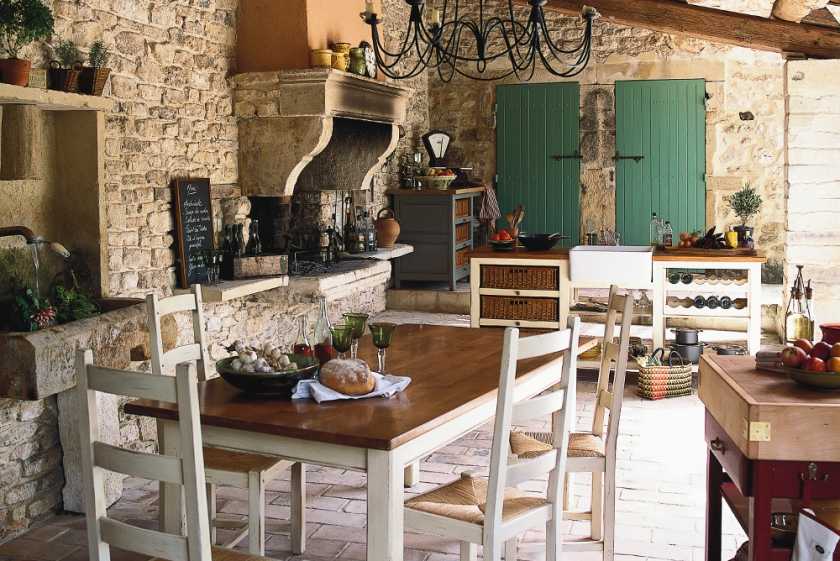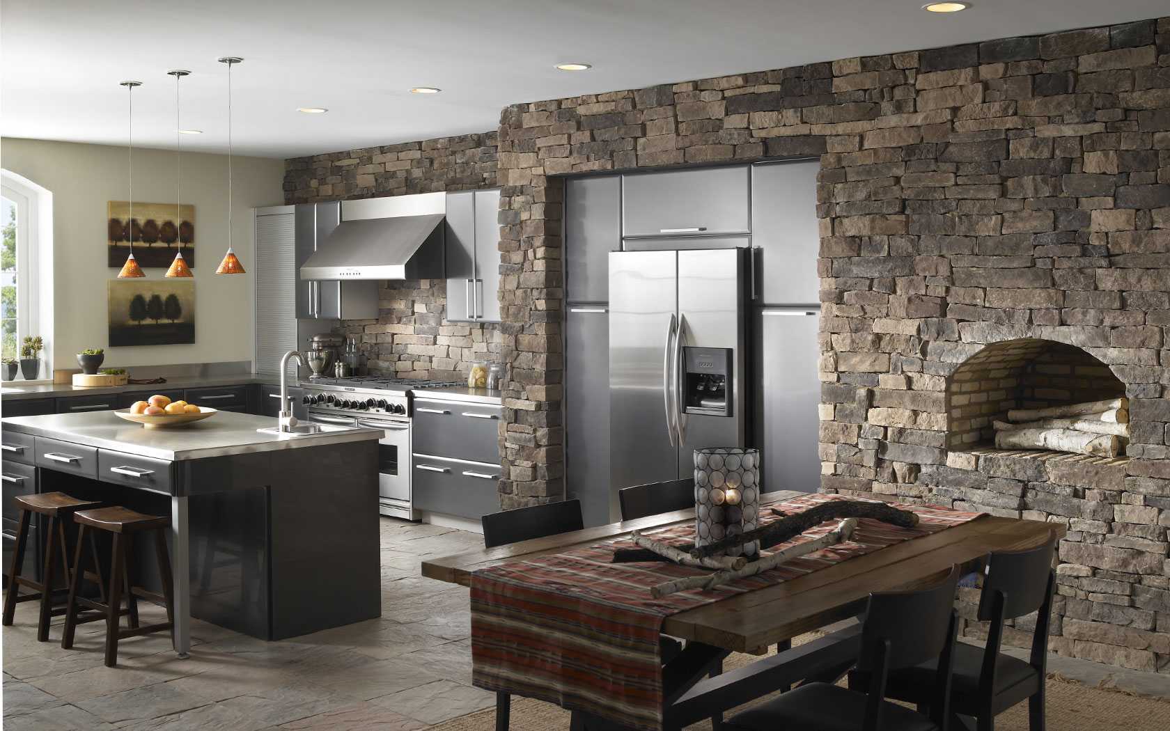 Оживите каменной отделкой фартук или дверной проем кухни в стиле кантри или прованса. При этом фактуру лучше подбирать выпуклую, грубую, или имитирующую кирпичную кладку. В оттенках дизайнеры не ставят определенных рамок, но советуют отдавать предпочтение светлым тонам кремовой и бежевой палитры.