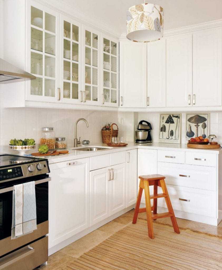 Даже небольшая кухня будет выглядеть намного больше, когда шкафы практически образуют «монолит», сливаясь со стеной. Кухня в белом цвете с деревянной столешницей (а также бело-серой столешницей) выглядит приятной для глаз.