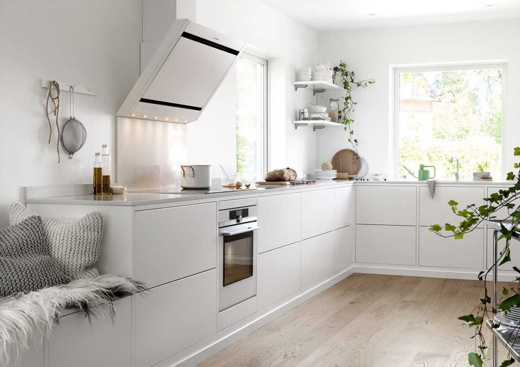 Подойдет матовый гарнитур с филенчатыми или гладкими фасадами. Глянец в скандинавском используют редко.