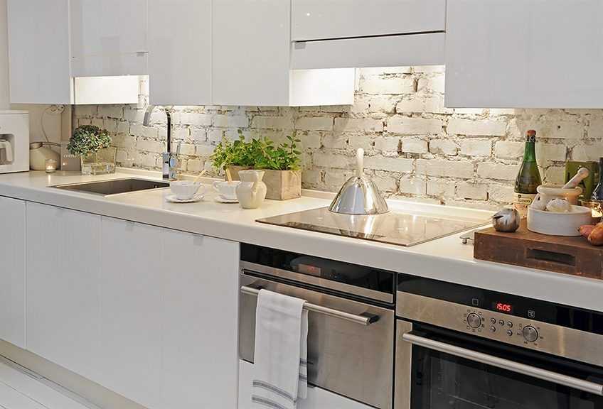 Так как белый цвет хорошо сочетается с другими, подобрать подходящей гаммы фартук будет не сложно. Единственно с чем нужно определится, это с материалом для отделки. К вопросу следует подойти с особой внимательностью, так как именно материал, его фактура и качество будут задавать общую стилистику кухни.