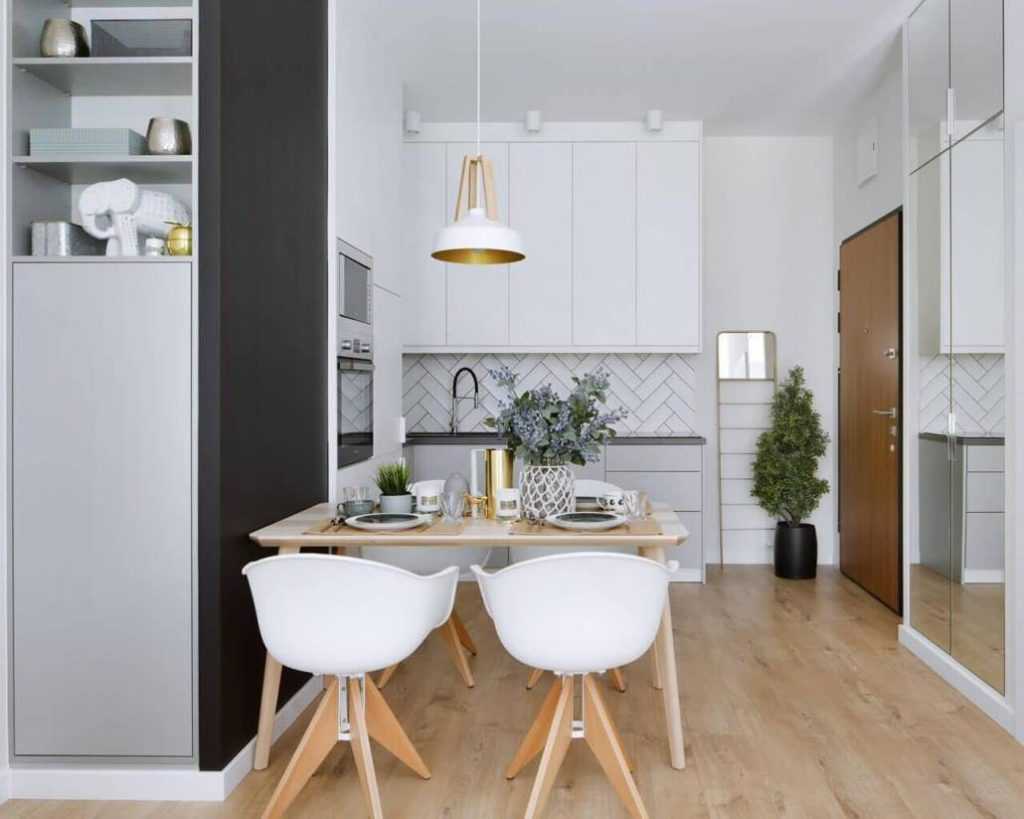 Прихожая в небольших квартирах обычно плавно перетекает в гостиную с кухонным уголком – чем меньше «жестких» разделов мы используем, тем дружелюбнее все.