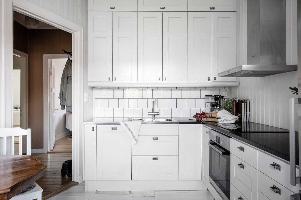 Если в наличии небольшая кухня, например, в хрущевке, и хочется применить к ней скандинавский стиль, то черная столешница на фоне белого гарнитура — лучшее решение, особенно, если подобрать глянцевое покрытие.