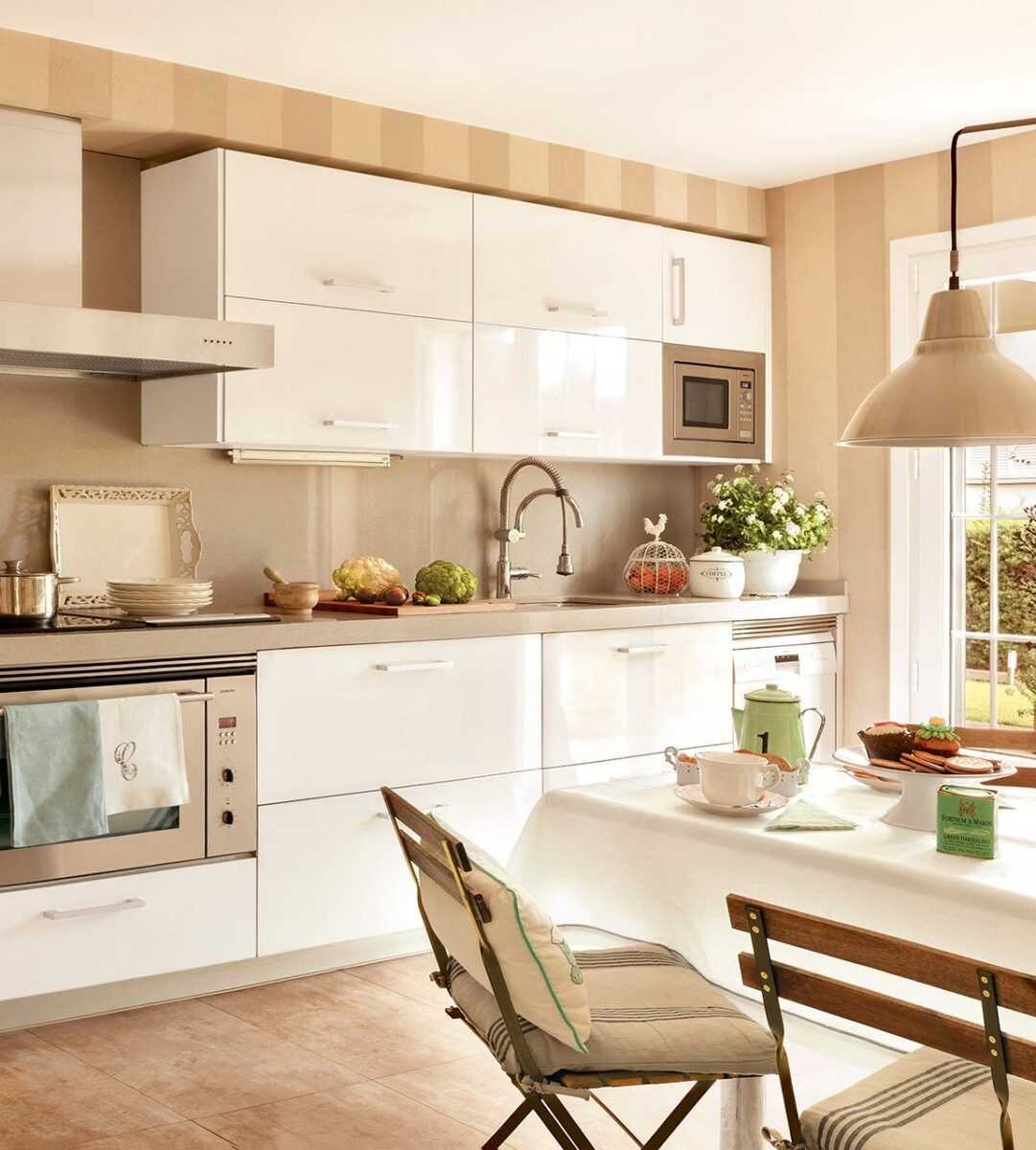 Бежевый цвет пусть и не трендовый, но остаётся распространённым, актуальным. Связано это с его многогранностью, неоспоримыми преимуществами при использовании в интерьере любой кухни: