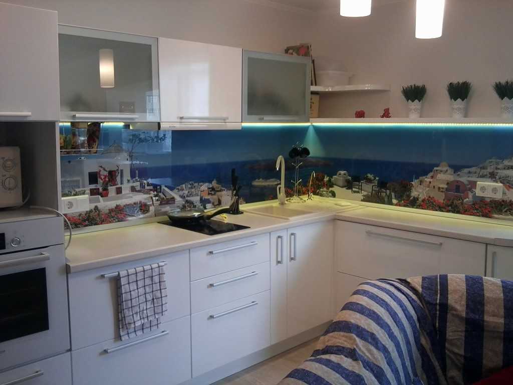 По сути, это стеклянный кухонный фартук. У него два основных плюса: красивый и легкий в уходе.