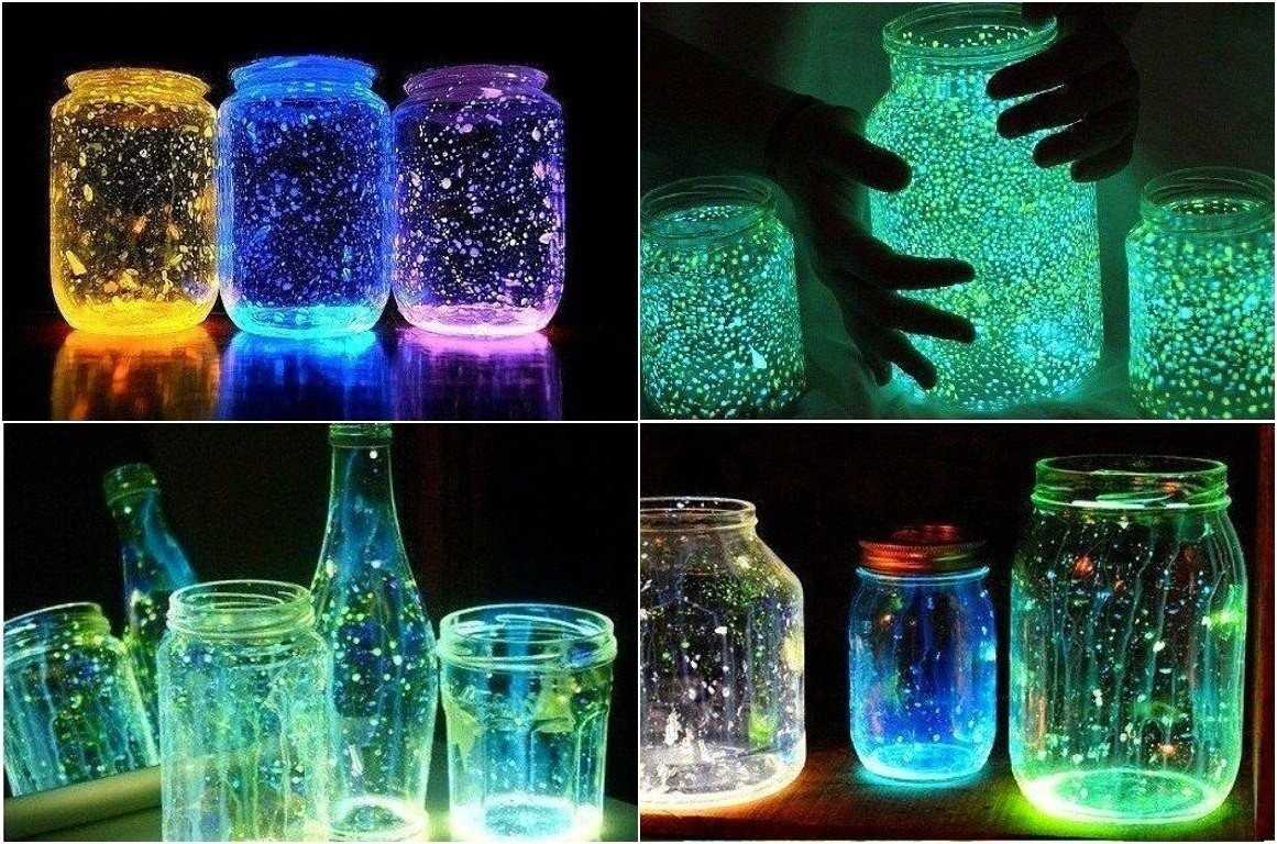 Достаточно разбрызгать люминофор по банке, и она превратится в декоративный объект, светящийся в темноте.