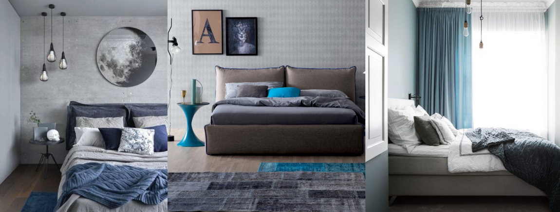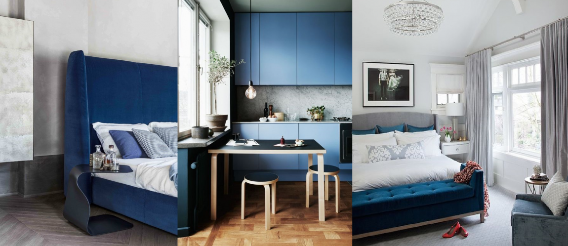 Проще всего собрать цветовую схему, используя только один оттенок синего и сразу несколько серых. Можно разбавить палитру белым цветом и светлой древесиной. Это универсальное сочетание подходит к любому стилю интерьера.