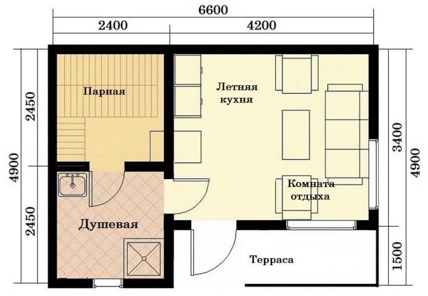 Зона отдыха может располагаться между баней и кухней, быть совмещена с кухней или вынесена на террасу. Проект может предусматривать две зоны отдыха: летняя и зимняя. Летняя зона отдыха располагается на улице. Это может быть крытая терраса, импровизированное лобби, беседка. Желательно место отдыха оборудовать навесом. Это позволит использовать ее в непогоду. При желании терраса или беседка дополняется съемными стеклянными панелями. Зимняя комната отдыха находится в помещении. Ее можно обустроить различной мебелью, диванами. Для зимнего отдыха будет уместно наличие камина.