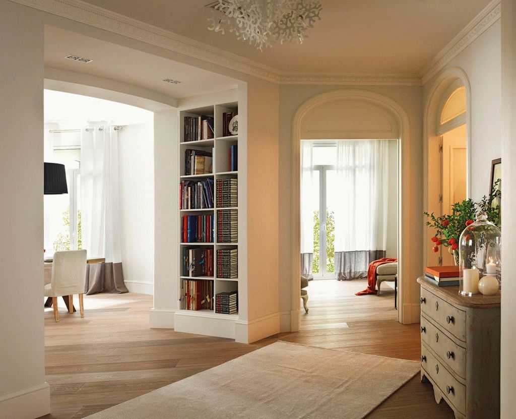 Довольно часто встречаются практичные варианты оформления открытых проемов, например, полочками с книгами, барной стойкой, подсветкой, таким образом превращая этот элемент интерьера в функциональную зону.