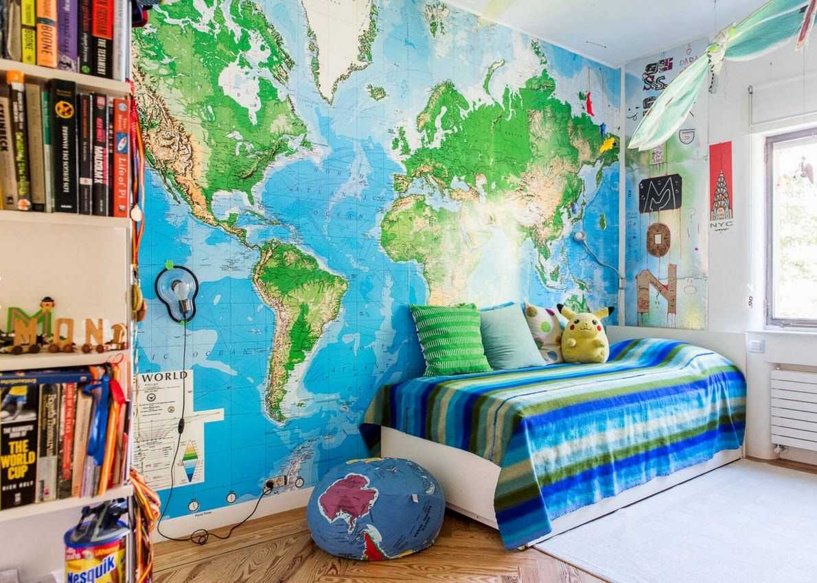 Для этого подойдет оформление стен с картами мира, размещением планет в солнечной системе, животными, динозаврами. Также возможны подушки и покрывала с написанными английскими словами или математическими примерами.
