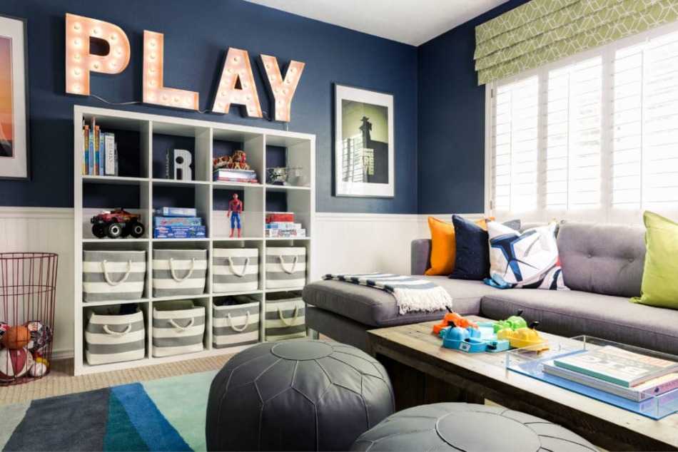 Чтобы оформить все возможные поверхности в комнате в любимые цвета детей – следует их покрасить блоками в выбранных цветах с учетом того, как они сочетаются друг с другом. Темные цвета стоит разбавить серыми, кремовыми, красными или белыми оттенками.