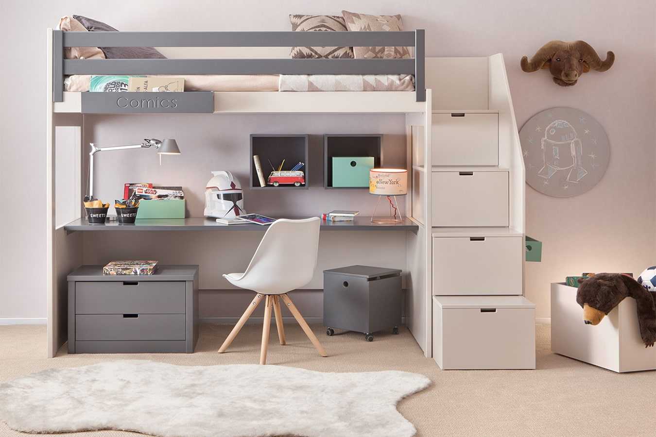 Пространство под кроватью можно использовать для вещевого шкафа, в лестницу можно вмонтировать множества выдвижных ящиков. Источник фото: shop.multo.org