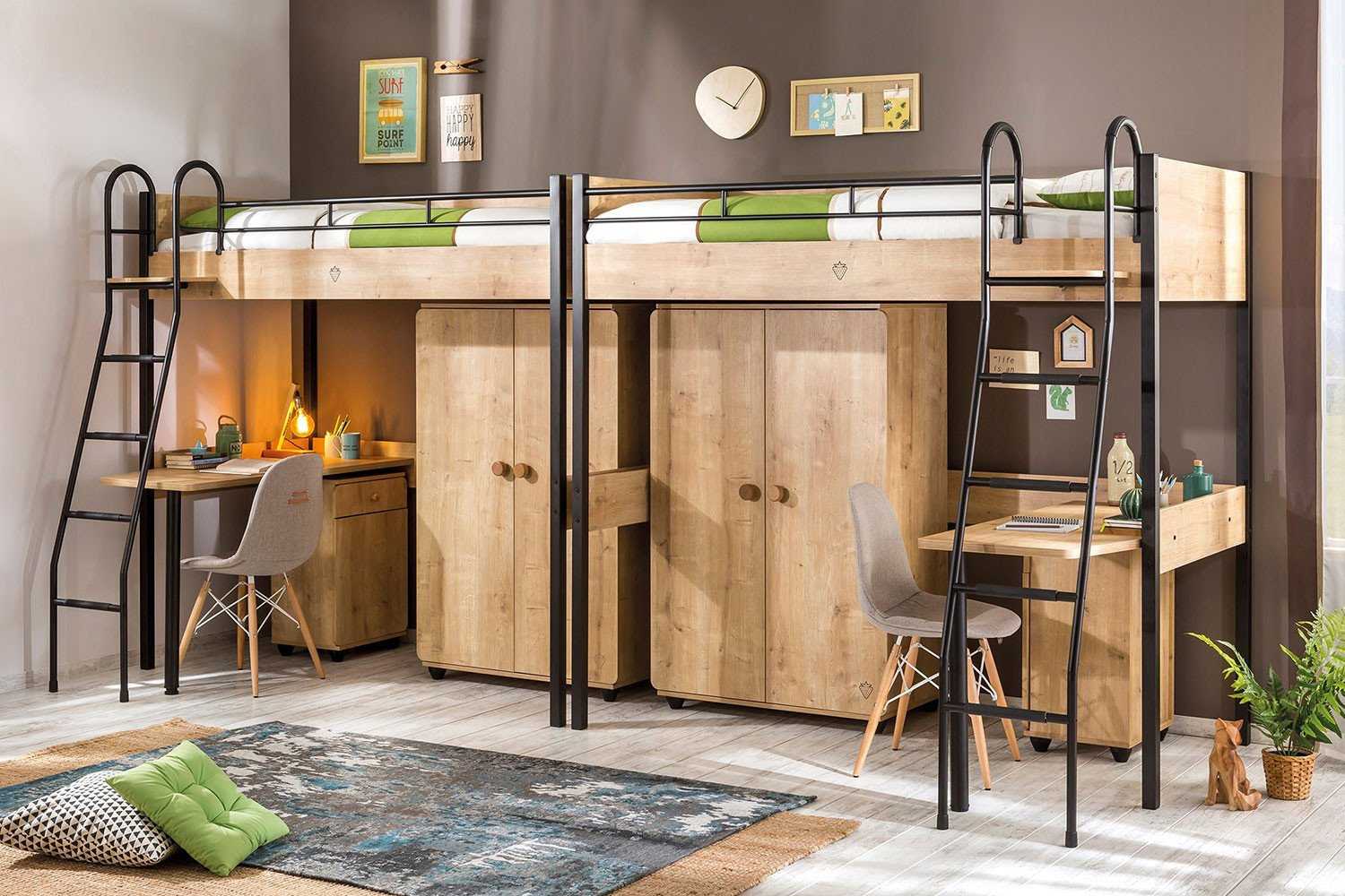 Если размер комнаты маленький, тогда на помощь придет кровать-чердак. Это сэкономит до трех квадратных метров площади. Пространство под кроватью можно использовать для вещевого шкафа, в лестницу можно вмонтировать множества выдвижных ящиков.