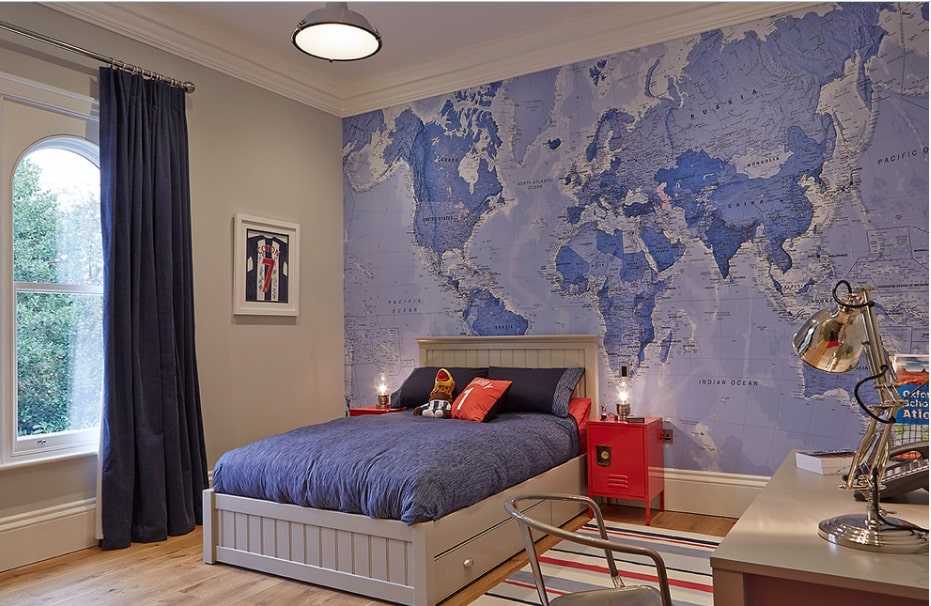 Этот дизайн детской комнаты для любителей фантастических приключений, готовых хоть сейчас отправиться покорять межгалактические просторы. Это стильное и практичное решение оформления детской, позволяющее не только создать для ребенка интересную обстановку, но и развить интерес к астрономии и географии. Для этого достаточно сделать на потолке проекцию звездного неба.