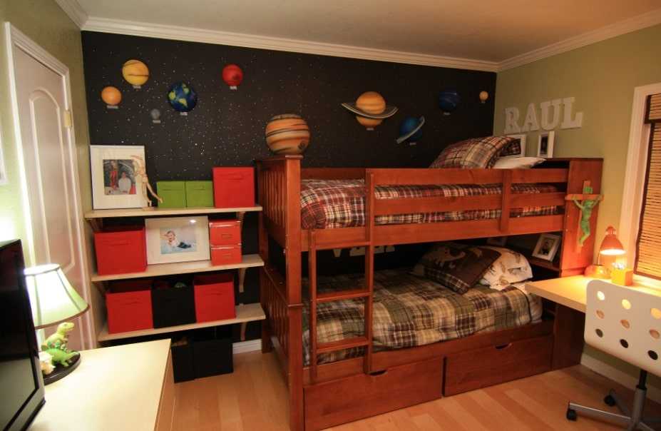 В дизайне активно используются фотообои, изображающие марсианские или лунные поверхности, натяжные потолки с подсветкой, светильники с абажурами, имитирующими планеты. Особенно ярко должна быть представлена зона игр.