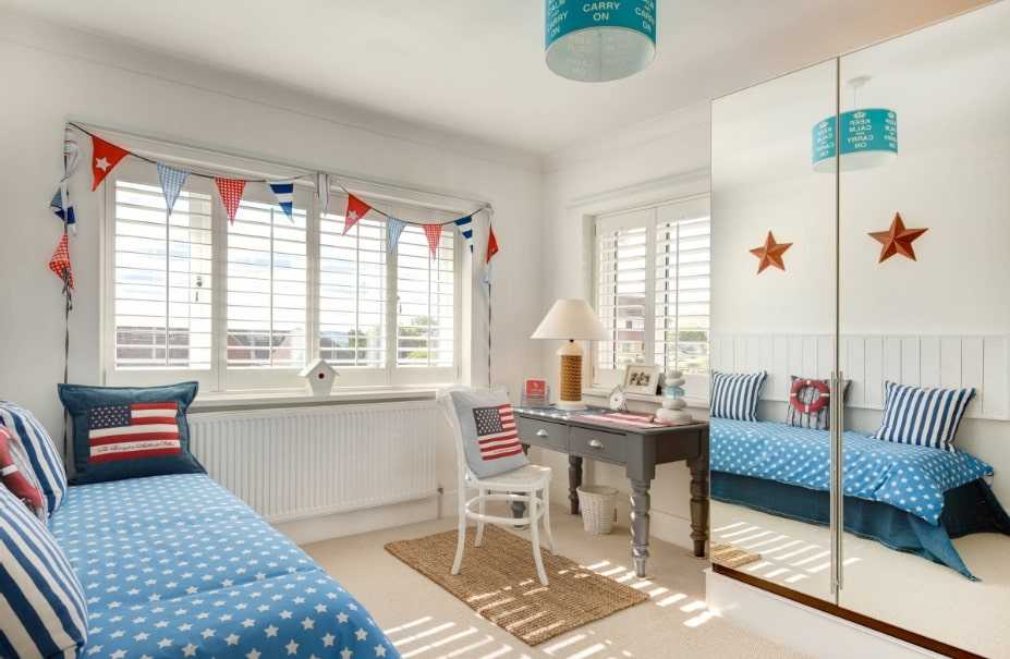 Данное направление придется по душе любому ребенку. Море – это лето и отдых, а соответственно отличное настроение. Цветовая гамма – классическая. Белый и синий цвета, разбавленные оттенками солнца и зелени. Мебель для такого стиля подходит деревянная, также можно сделать стилизованные акценты, например, якорь или штурвал. Если найти место для гамака, то интерьер заиграет новыми красками.