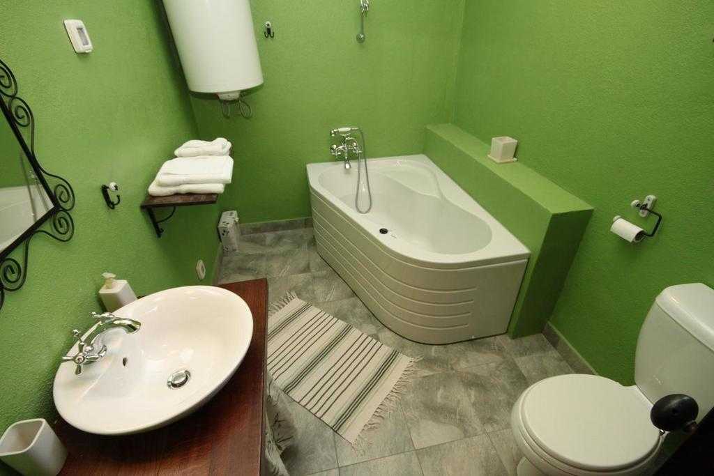 Беспроигрышным классическим вариантом считается бело-зеленая ванная комната. Чтобы цвета гармонировали друг с другом, можно отделать стены зеленым, а потолок с полом – белым. Мебель в этом варианте лучше поставить белого цвета. Такое сочетание оттенков подойдет к ванной комнате любого размера.