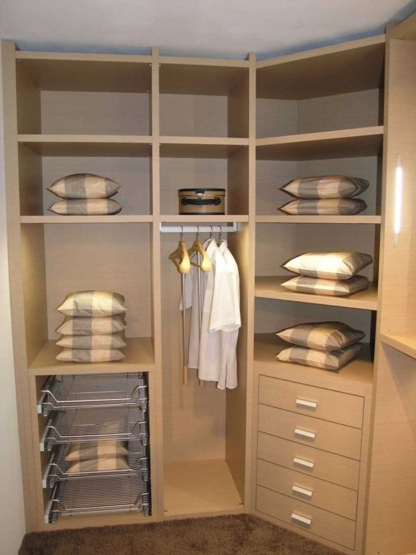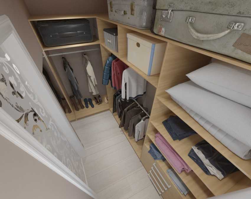 На подобной маленькой части пространства можно поместить лишь несколько полок, где, например, будет храниться одежда. Для белья следует дополнительно оборудовать полочки.