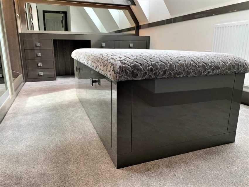 Каждый владелец украшает гардеробную в соответствии с собственными предпочтениями. Например, на фото дизайн проектов гардеробных комнат посреди комнаты можно увидеть изящный столик или красивый мягкий пуфик. Часто используется вариант установки кресла в виде груши. Это придает оформлению комнаты некий налет небрежности.