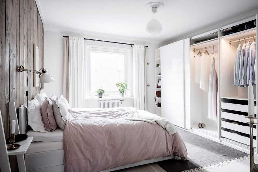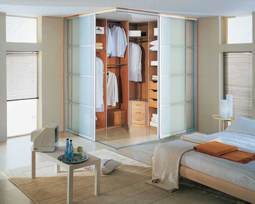 часть спальни или другой жилой комнаты. Небольшую гардеробную можно получить, если отгородить угол или торец помещения, причем использовать можно как стационарные перегородки, так и раздвижные двери. Этот вариант будет идеален, если спальня сильно вытянута в длину, тогда можно не только выделить гардеробную, но и придать комнате правильную геометрию. Угол помещения отделяют часто в тех случаях, когда в смежных стенах есть двери или окна, и угол все равно никак обустроить невозможно;
