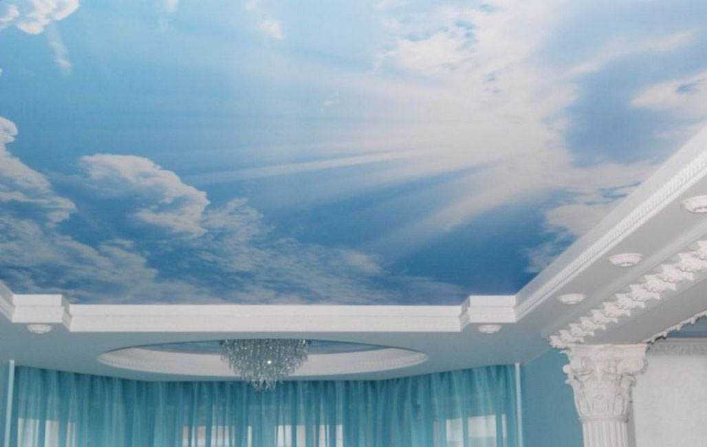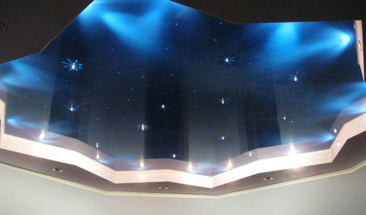При этом нарядность потолку может придаваться посредством выбора контрастного цвета пленочного материала либо фотопечатью, фактурой, встраиванием внутрь пленки оптоволокна и светодиодной ленты. Эффект у таких потолков потрясающий: они кажутся объемными и способны придать высокий статус любому интерьеру. Однако все можно испортить выбором рисунка: ни огромные цветы, ни парящие гигантские голуби не создадут в зале комфортную атмосферу.