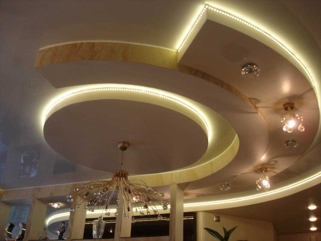 При многоярусном допустимо не вешать люстру, а, к примеру, заменить ее встроенным видом освещения. Такие светильники, позволяют отлично выделять нужные участки в комнате. Кроме того, данное освещение сделает комнату более уютной, если вы поставите световое реле или установите несколько отдельных групп светильников для регулировки уровня освещения. Так, вы сможете варьировать освещенность комнаты начиная от романтичного полумрака, заканчивая дневной освещенностью. Еще есть возможность сделать подсветку из разных цветов.