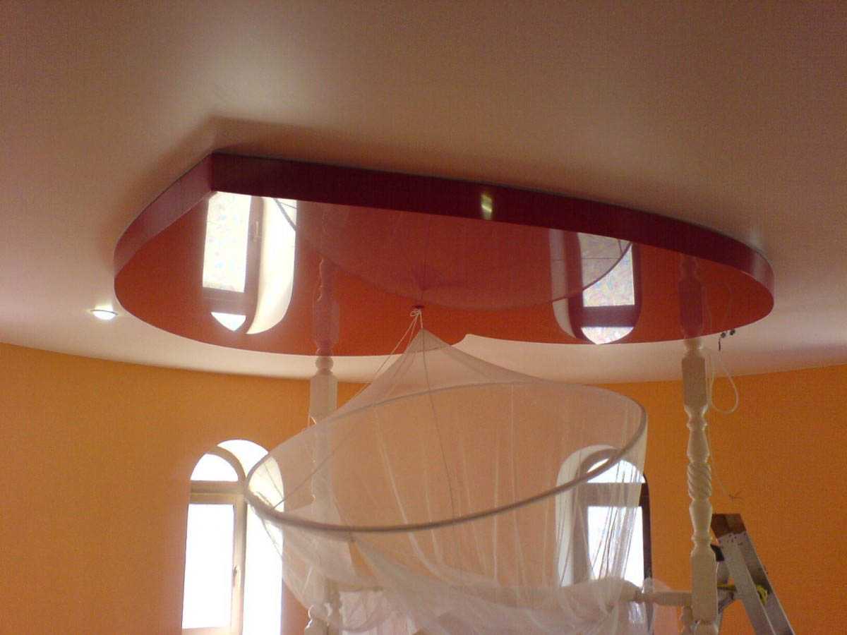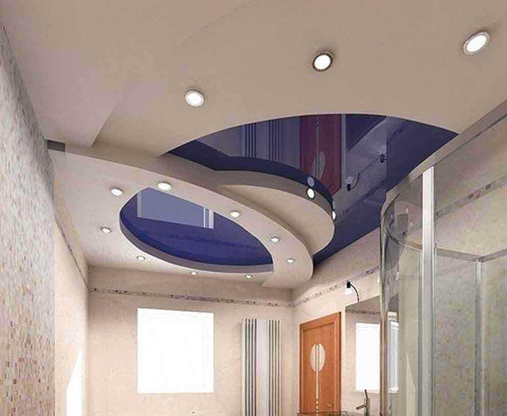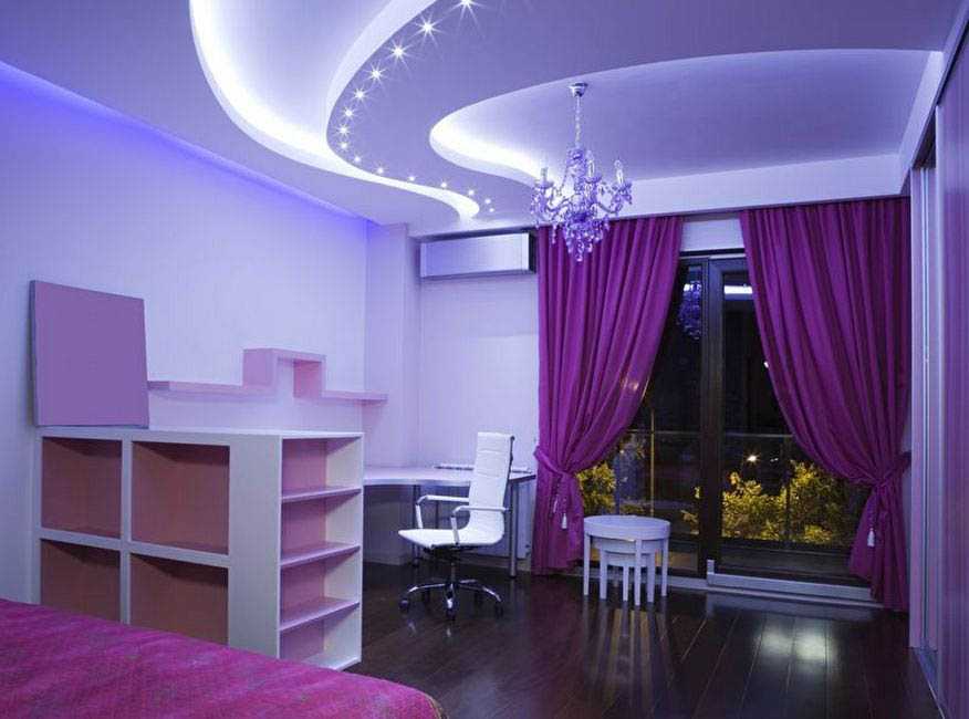 Его можно покрасить абсолютно в любой цвет, встроить необычным образом подсветку. При желании можно, сделать фигурным, с интересными узорами, соорудить рельефную модель геометрической формы. Если комната не очень низкая по высоте, то можно себе позволить установить двухъярусный подвесной потолок или даже многоярусный.