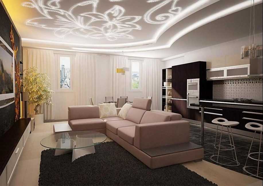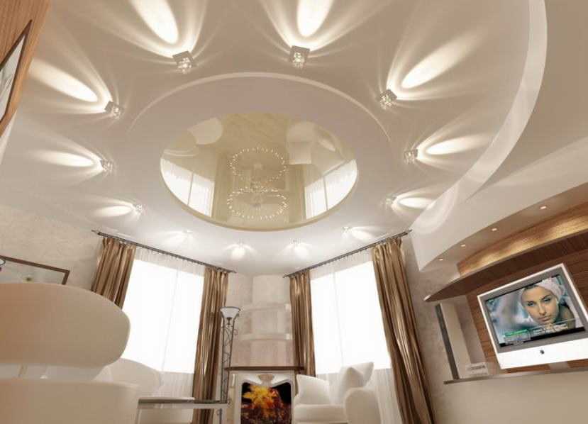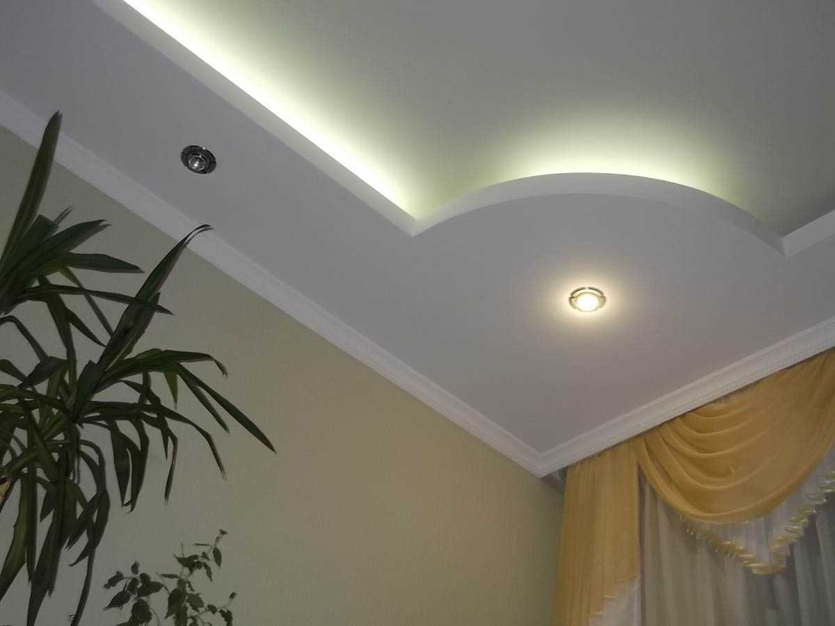В дополнение к основному освещению зала от люстры или световых панелей монтируется подсветка, без которой поверхность сильно теряет в оформлении.