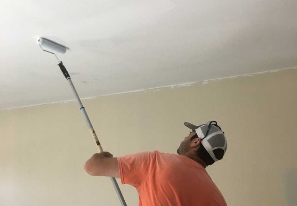 При покраске потолка из гипсокартона следует пользоваться отдельной технологической картой для малярных работ. Декоративный материал наносится в 3 слоя, каждый из которых ложится перпендикулярно предыдущему. Работы начинаются от угла помещения, вдоль стены с окном.