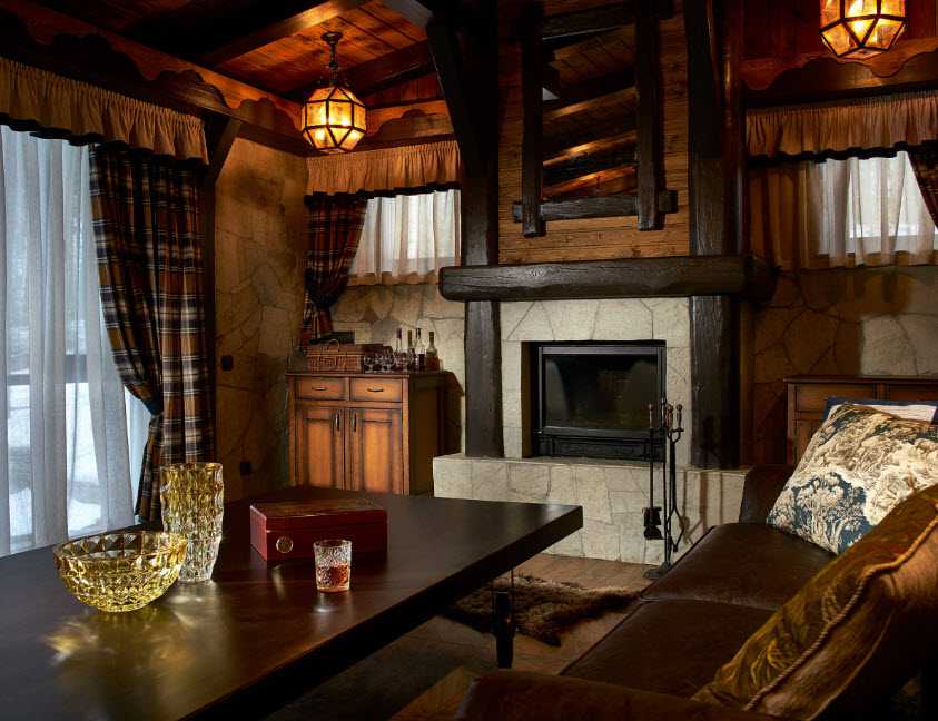 - «шале» (облицовка камина натуральным камнем с расположением больших панорамных окон и балок на потолке);