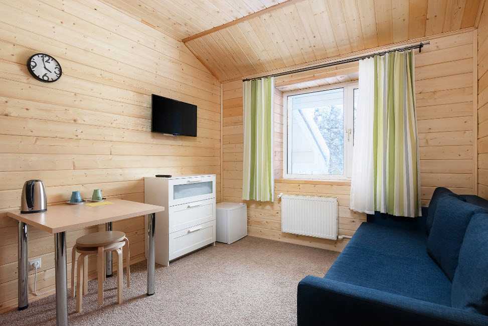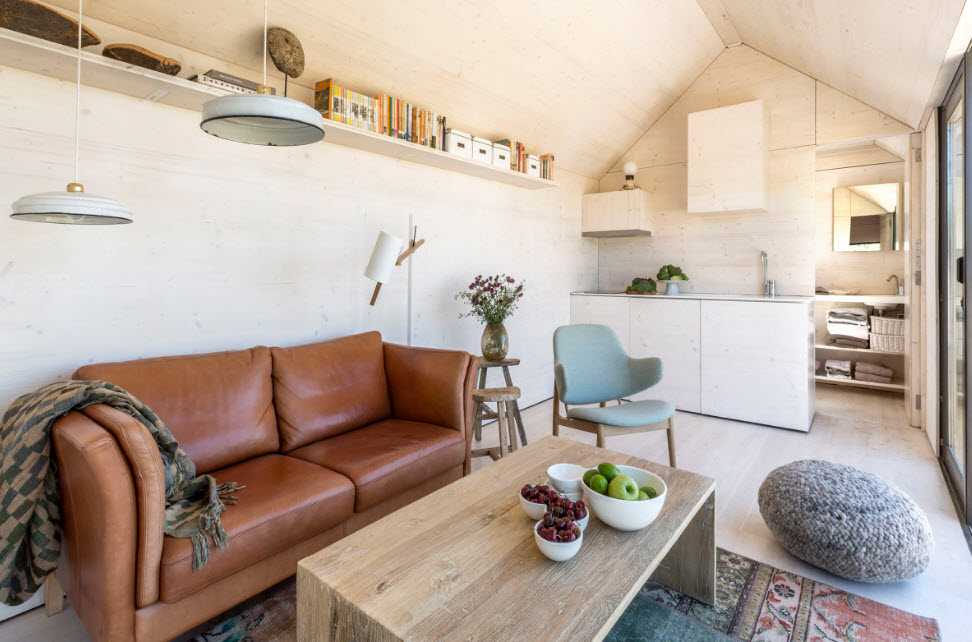 Светло-коричневый интерьер дачного домика привлекает внимание, подчеркивает уютную и теплую атмосферу. Чтобы помещение смотрелось еще более светлым, организовывают правильное освещение