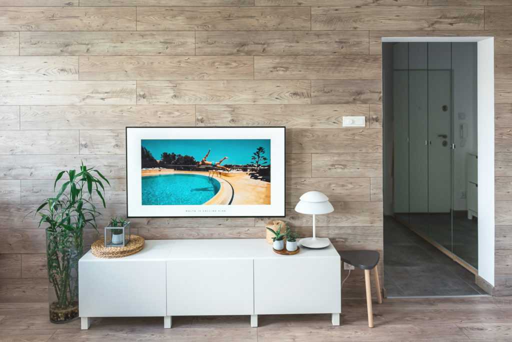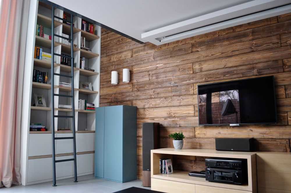 Отделка под дерево в гостиной — деревянная стена в гостиной